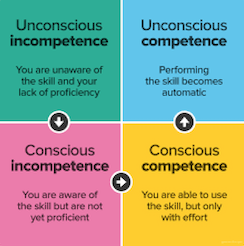 The first stage of competence is actually anything but competence, it is the ‘unconscious incompetence’ stage (or the ignorance stage). This is where most of us start on most things in general. In this stage, we simply do not understand or know how to do something and we don’t even recognize the deficit. According to the model theory, we may even deny the usefulness of the skill entirely. In order to move on to the next stage we must recognize our own incompetence, and the value of the new skill(s).