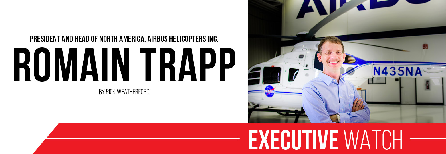 The Airbus Helicopters Inc. president and head of the North America region for helicopters was once so shy he was afraid to phone anyone he didn’t know. Romain Trapp says, “I was really super shy. I had to write down in advance every word I planned to say in a call.” So, the college accounting and finance student got fed up with his handicap and devised a strategy to overcome it. “I came to the point where enough was enough and I began to force myself out of my shyness,” he says. “For example, I volunteered to organize a conference at my college; it forced me to interact with people. Eventually, I worked my way out of my shyness, so that I now have no problem speaking to an audience of 200 people.” That’s a good thing, because presiding over a global original equipment manufacturer (OEM) like Airbus Helicopters is not a cubicle-in-the-bowels-of-a-building position for the super shy. It requires someone who can get out into the rotorcraft world, see how it’s changing, and react. When pressed to talk about his personal strengths as a top corporate executive , the humble leader says, “My strength, I think, is my ability to grasp the big picture and develop strategy from that view. Also, I develop a sense of belonging to the team as soon as I start a new job. You’ll notice that when I talk, I use the word ‘we’ and never ‘them’ nor ‘I.’ Finally, I have developed an ability to adapt to changing circumstances because I’ve had different responsibilities in different countries.”