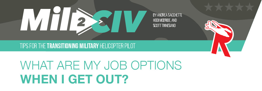 About the authors: Andrea Sacchetti is a retired U.S. Coast Guard pilot and is now a base lead pilot for REACH Air Medical Services in California; Heidi McBride was a helicopter crew chief in the U.S. Coast Guard and is now a VFR captain in the oil and gas industry; Scott Tinnesand was a U.S. Army pilot and now is an experimental test pilot with The Boeing Company. All three are co-chairs of the Mil2Civ Transition Course at HAI’s Heli-Expo.
