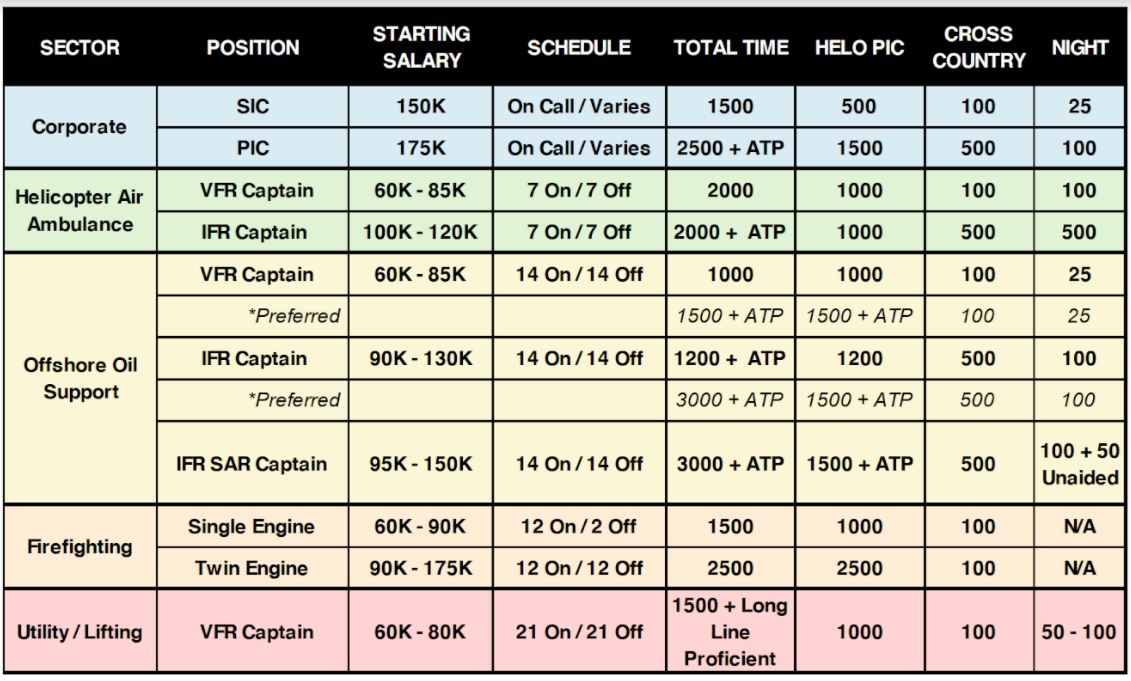 Some of the biggest questions military pilots ask when transitioning to the civilian pilot sector are: “What kind of flying jobs are out there for me?” “Which helicopter jobs am I qualified for?” “How much money will I make?” Plus many more questions. To find answers, we looked at our own niche in the helicopter industry and asked our friends in other flying jobs for the information to assemble an overview. The data includes flight hours required, rough starting wages, standard work schedule and other additional information. Just like the caveat you hear for any diet or exercise program: individual results may vary! Treat this information as a general guide. Starting wages, for example, vary widely based on location, type of aircraft, personal flying experience and much more. For more specific data, see the Mar/Apr 2021 issue of Rotorcraft Pro and its annual Pilot Salary & Benefits Survey.