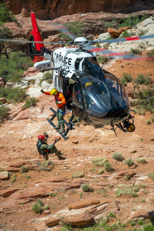 Another aviation team that bolsters the city and its surroundings is the Las Vegas Metro Police Department (LVMPD) Air Support/Search and Rescue Section. Director Steve Morris, says that the unit’s mission is clear: Provide air support to all sections of the department and any concurrent jurisdictions within Clark County. Their law enforcement helicopter operations date back to 1969 when the City of Las Vegas Police purchased and operated a Hughes 300. In 1973, the Las Vegas PD and the Clark County Sheriff’s Office merged and became the unit it is today. In the decades since then the program has flown Hughes 300, MD 500 (C,D,E), and two retired Air Force Bell HH-1H Hueys. Today, the unit flies one Airbus H145 in search and rescue configuration and three MD 530FFs in LE configuration.
