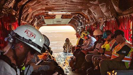 Civilian search and rescue on board a CH-47F Chinook helicopter operated by New York Army National Guard soldiers assigned to B Company, 3rd Battalion, 126th Aviation Regiment heading to a mission on Sanibel Island, Florida. (Photo: Sgt. Samuel Sacco, Army National Guard)