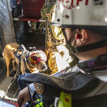 A member of Miami-Dade Fire Rescue - Florida Task Force 1, comforts their dog while aboard a CH-47 Chinook helicopter assigned to Company B, 1st Battalion, 111th Aviation Regiment, Mississippi Army National Guard, above Fort Myers, Florida. The 111th is deployed to South Florida to respond to the devastation of Hurricane Ian. (Photo: Sgt. Jovi Prevot, Army National Guard)