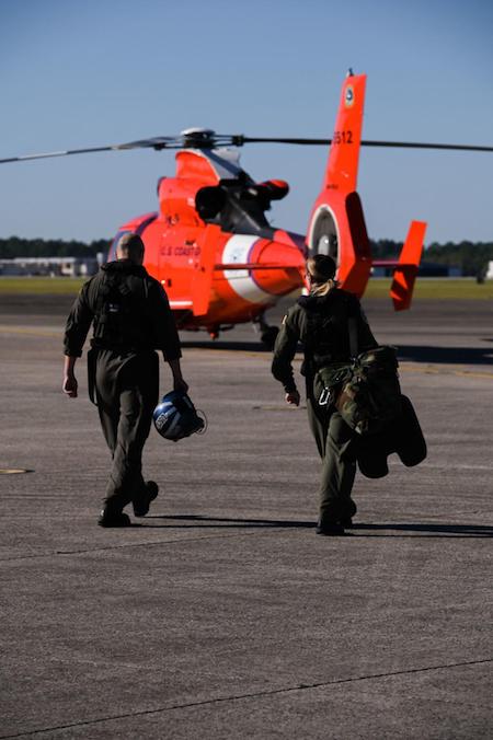 Coast Guard Aviation Training Center-Mobile pilots walk out to an MH-65 Dolphin helicopter to conduct training evolutions in preparation for storm response operations in Mobile, Alabama. Coast Guard assets are staged outside of the predicted path of Hurricane Ian at the Aviation Training Center. (Photo: Petty Officer 3rd Class Riley Perkofski, USCG)