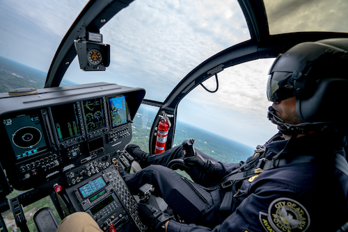 According to Sergeant Keeley Miller, the unit’s lead pilot and instructor, once an officer comes off the street and into the aviation unit, they’re trained to become the TFO. The TFO’s main job is to operate the communications equipment, on-board mapping system, hi-definition camera, and tactical searchlight to support and direct ground units during a call. Types of calls may vary, but can include search, surveillance, patrol, pursuit, and using the aircraft as an aerial command post.