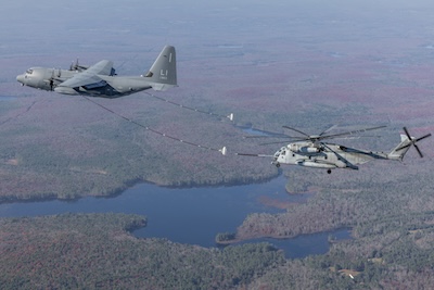 “Training this specific skill is one of the things that is harder to schedule: you have to have good weather, the aircraft have to cooperate maintenance wise, and you have to have the external support of the C-130 Hercules unit. As a result we don’t do it as routinely as we would like to do, so every time you are knocking off a little bit of rust. There is a very small margin for error, and as a result your stress level is a little bit higher. Helicopter air-to-air refueling is heavy finesse,” adds Major Jason W. Stapleton, operations officer at HMH-772. He was commissioned in May 2007 and earned his wings in 2009. He started training on the TH-57 in Pensacola and completed flight training on the CH-53E in April 2010 with HMHT 302 at MCAS New River and became assigned to HMH-366, also based at MCAS New River. Stapleton was subsequently deployed to Afghanistan in the Helmand Province. From November 2011 until the summer of 2012, he was deployed back again to Afghanistan. He participated actively in relief efforts during Hurricane Sandy from October till November 2012 with the 26th Marine Expeditionary Unit deployed aboard the USS Wasp (LHD-1). In April 2016 he went to HMX-1 at MCAS Quantico to fly the Presidential helicopters and moved in July 2021 to HMH-772 at Joint Base McGuire-Dix-Lakehurst to become Operations Officer in charge of flight planning and exercises. To date, he’s accumulated 2,500 flight hours with 500 during combat.
