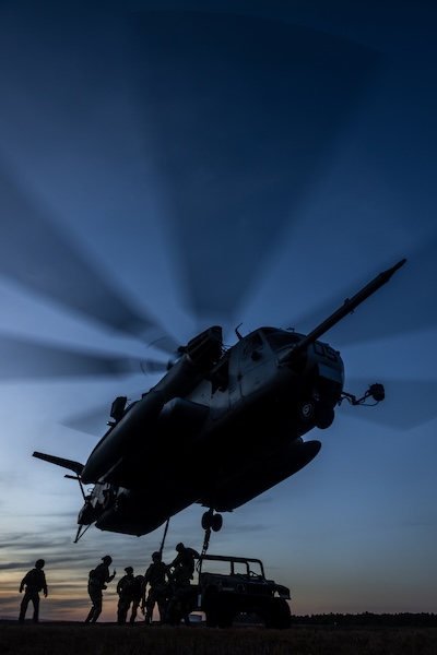 Airmen of the 321st Contingency Response Squadron / 621st Contingency Response Group based at Joint Base McGuire-Dix-Lakehurst, attach a Humvee vehicle to a CH-53E at Lakehurst Maxfield Field during a training with HMH-772 (-). The 321st CRS is specialized in training and rapidly deploying personnel globally to quickly open airfields and establish, expand, sustain, and coordinate air mobility operations during a variety of contingency operations.