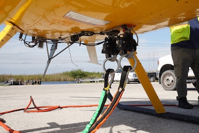 Developed to make placing marker balls more efficient and running on an Android OS, crews use an app that shows the exact location of the aircraft relative to the powerlines and the exact location of where the marker balls are to be placed on the line. As the pilot navigates down the line, the voice-guided GPS generates audible commandsL: “30 feet ahead on line. 20 feet ahead on line. 10 feet ahead on line. One foot ahead on line. Place. Place. Place.” This new technology replaces a manually installed measuring wheel, which is placed on the static line and pulled down the line.