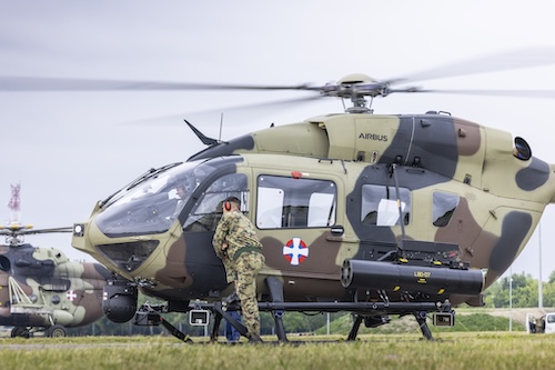 A founding member of the European Defense Agency, Serbia made its debut at an MHTC exercise this year, contributing two helicopters: the brand-new Airbus H145M and the Mil Mi-17V-5 Hip, both from the 890th Mixed Helicopter Squadron (Meshovita Helikopterska Eskadrila) based at Batajnica Air Base near Belgrade. The H145M has been in service with the Serbian Air Force since 2019. During Fire Blade 2025, it fired 80 mm S8-KOM unguided rockets from a locally produced L-80-07 seven-tube rocket pod. The Mi-17V-5 participated in several ground-force training missions during the exercise, including fast-roping and rappelling operations. Another first-time participant during a Fire Blade exercise was the Swiss Air Force, which deployed three AS532UL Cougar helicopters from Alpnach Air Base to Pápa. Slovakia also joined with a UH-60M Black Hawk helicopter from the 1st Helicopter Squadron (1. Vrtuľníková letka) based at Prešov Air Base. Both Switzerland and Slovakia have announced their intention to join the MHTC as its fifteenth and sixteenth member nations, respectively.