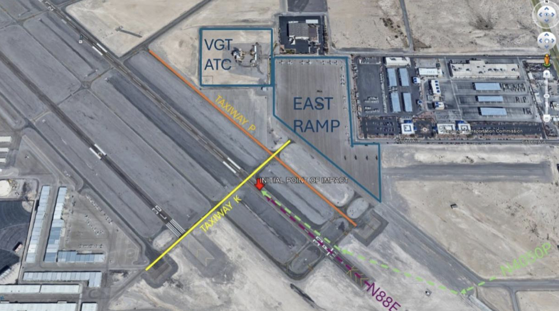 Figure 2. View of initial point of impact in relation to Taxiway Papa, Taxiway Kilo, the East Ramp, and ATC.