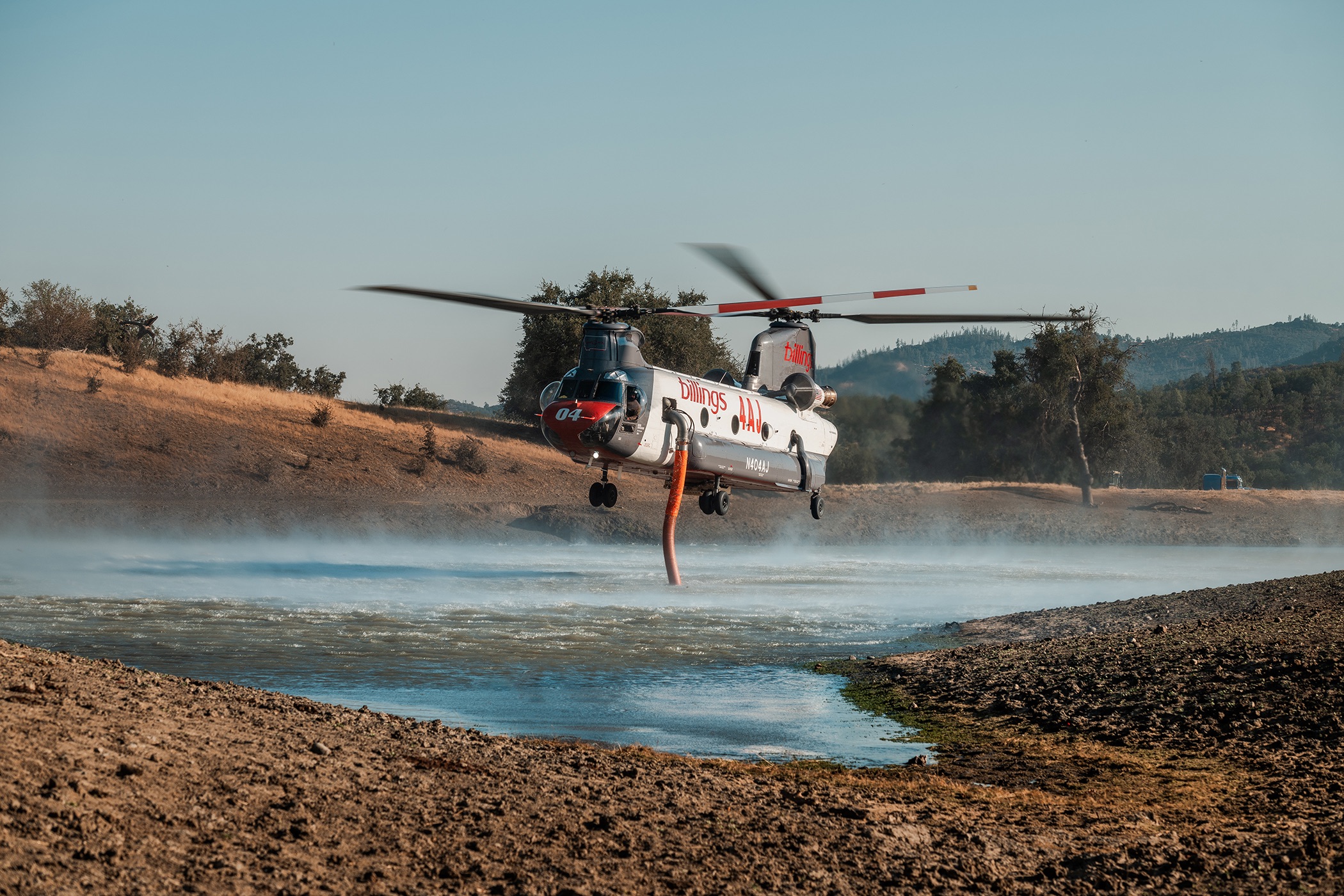 Caption: A BFS CH-47D fills in a lake before performing a water drop. Photo Credit: Trevor Wert