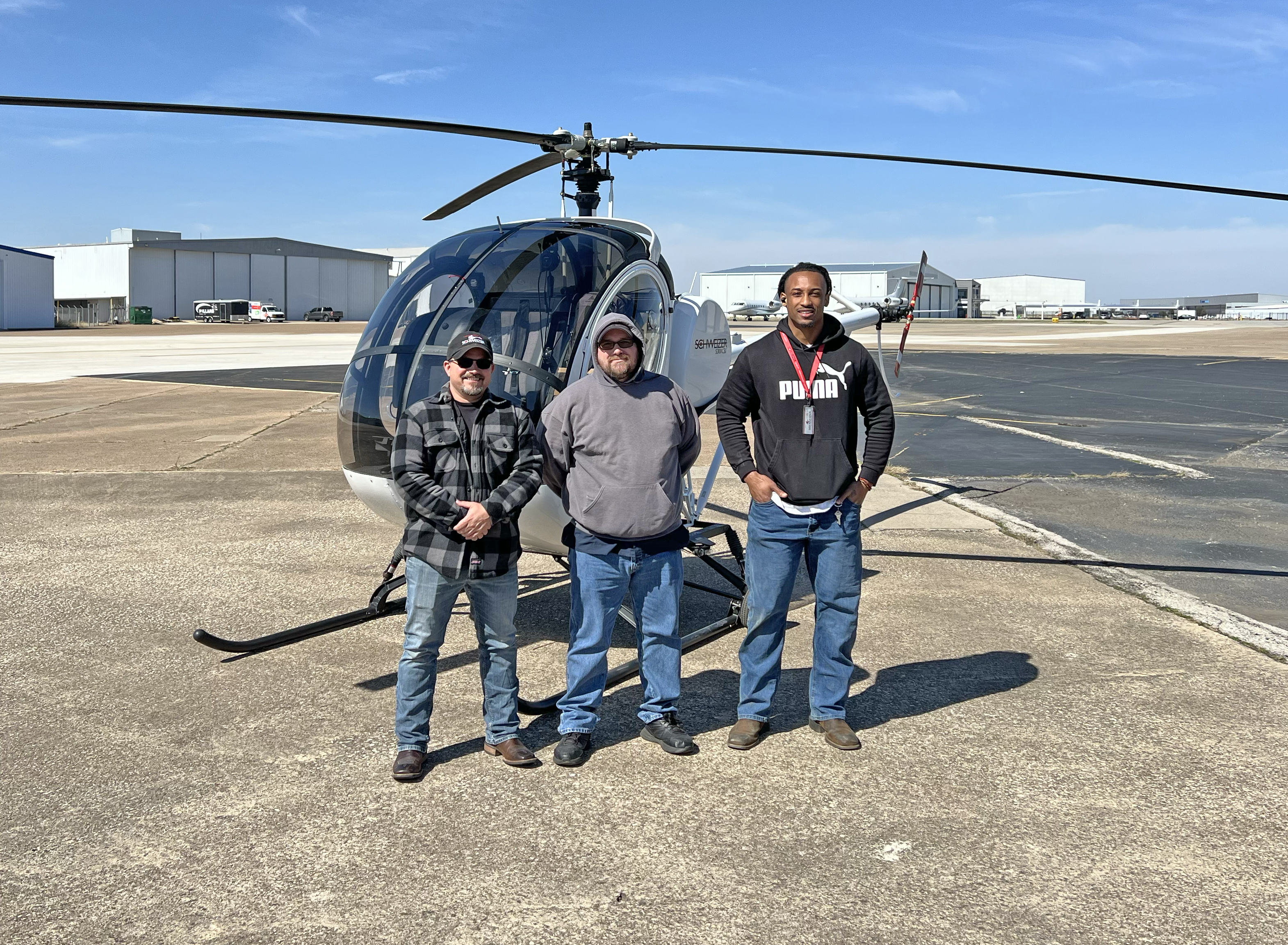 (L-R) Schweizer Chief Pilot Michal Birdsell, USATS Assistant Chief Flight Instructor Jason Krum, and Schweizer Maintenance Technician Malik Williams at USATS's new helicopter dedication.