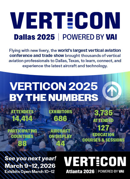 “We are thrilled with the overwhelming success of VERTICON 2025,” says James Viola, president and CEO of Vertical Aviation International (VAI). “This year’s event was an extraordinary opportunity to bring the vertical aviation community together and showcase the incredible progress being made in our rapidly evolving field. Vertical flight technology is poised to play a pivotal role in reshaping air transportation and creating more sustainable solutions for the future.”