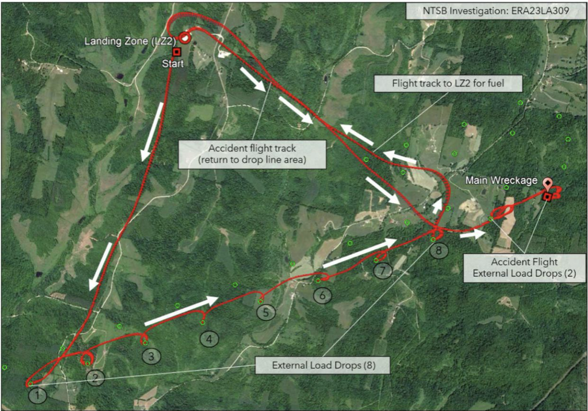 Flight track data indicated that the pilot maneuvered the helicopter southeast of LZ2 for about 45 minutes. The pilot completed one cargo load drop involving a bag that weighed 130 pounds, resulting in a helicopter external load weight of 940 pounds after the drop. The pilot then maneuvered toward the next drop zone. The flight track showed that the helicopter circled over the area of the accident site before descending through trees in a near-vertical (straight-down) path and impacting terrain. Figure 1 shows the helicopter’s path over the drop zones and the locations of LZ2 and the accident site.