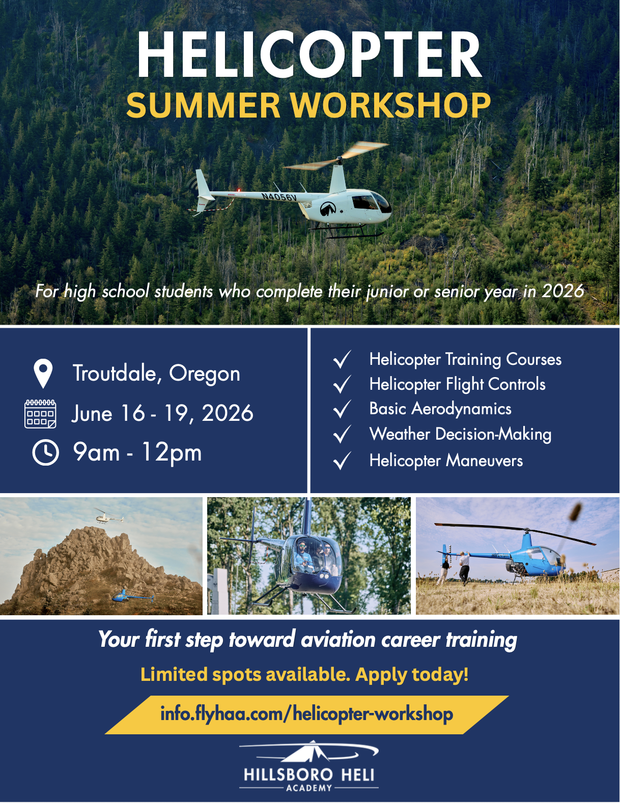 TROUTDALE, OREGON — Hillsboro Heli Academy, the helicopter training division of Hillsboro Aero Academy, is excited to announce its upcoming Helicopter Summer Workshop for High School Students, designed to give aspiring pilots a hands-on introduction to helicopter flight training and careers in helicopter aviation.