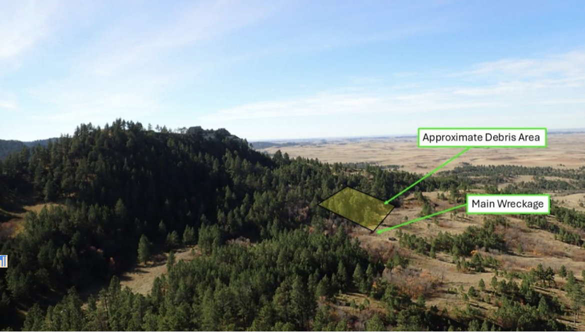Examination of the accident site revealed that the helicopter impacted an open field adjacent to a wooded area within the Chalk Buttes range at an elevation of 3,779 ft mean sea level. The helicopter came to rest on its left side, on a heading of 093°. The wreckage debris area was located southwest of the main wreckage and was about 300 ft wide by 300 ft long. The debris area contained fragments of Plexi glass, the left front and rear doors, tailrotor driveshaft cover, vertical and horizontal stabilizers, tailrotor, and the pilot side GPS mount. (See figure 1.)