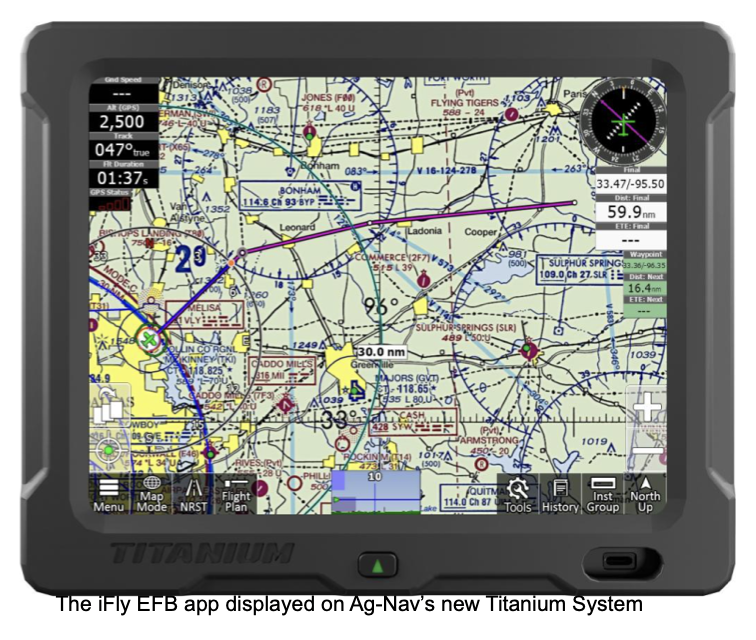 “We’re thrilled to bring the iFly EFB experience to Ag-Nav’s Titanium platform,” said Juanita Boyd, Vice President of Operations at Adventure Pilot. “This collaboration marks an exciting step forward for aerial applicators, giving them the same advanced navigation tools trusted by thousands of general aviation pilots worldwide—now built right into their mission system.”